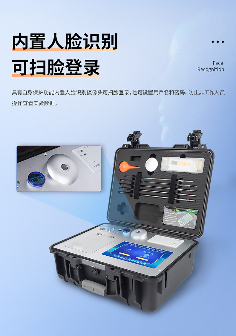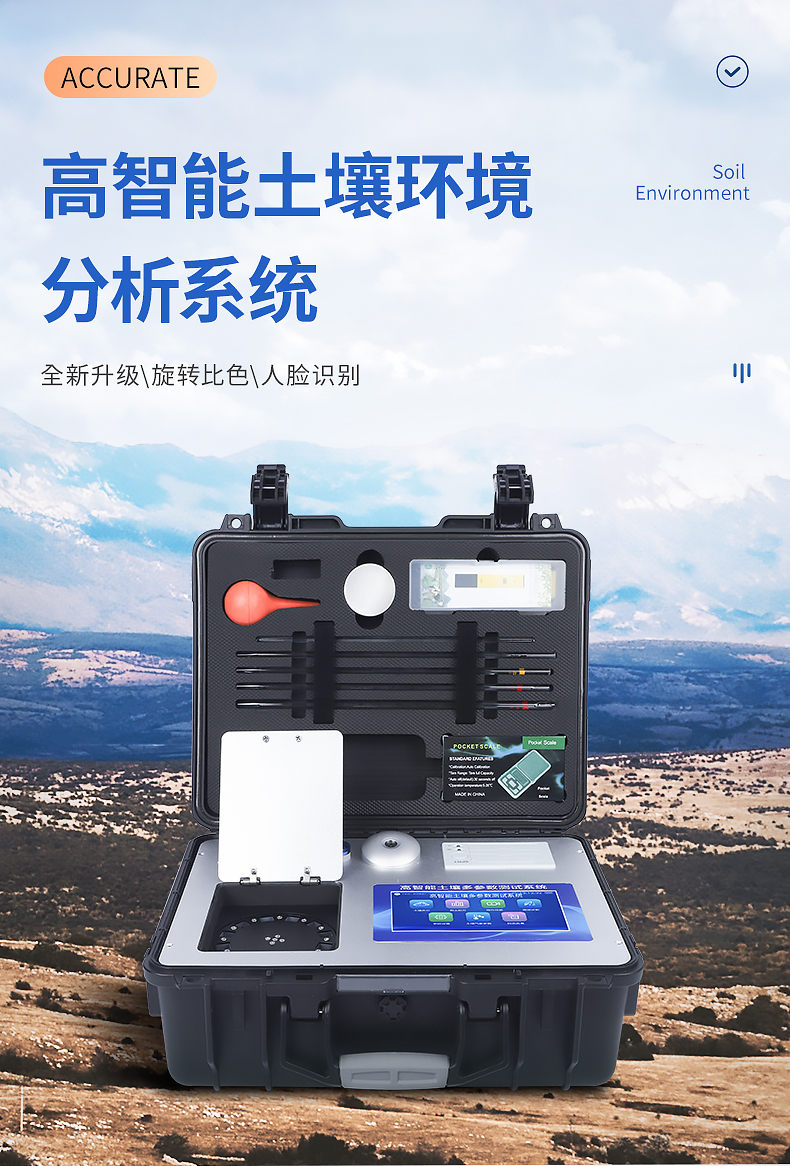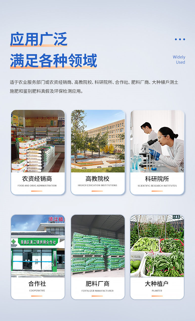 配套齊全:該儀器集藥、器、儀為一體,攜帶方便,相當(dāng)于一個(gè)小型移動(dòng)實(shí)驗(yàn)室,無(wú)需用戶自配附件,亦可靈活野外流動(dòng)測(cè)試。適于農(nóng)業(yè)服務(wù)部門或農(nóng)資經(jīng)銷商、高教院校、科研院所、合作社、肥料廠商、大種植戶測(cè)土施肥和鑒別肥料真假及環(huán)保檢測(cè)應(yīng)用。