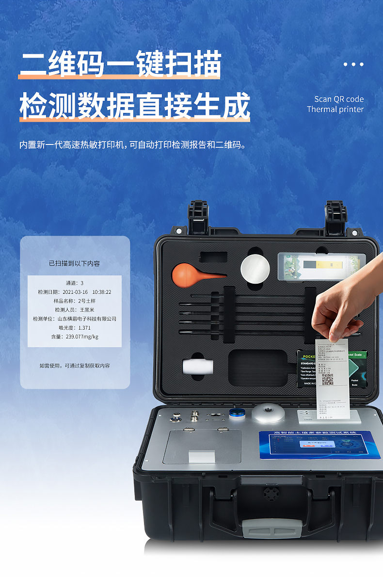 ★21、內(nèi)置新一代高速熱敏打印機(jī)(無(wú)需色帶),打印內(nèi)容包含:檢測(cè)單位、檢測(cè)人員、檢測(cè)項(xiàng)目、通道號(hào)、吸光度、養(yǎng)分含量(mg/kg)、檢測(cè)時(shí)間、以及二維碼等信息