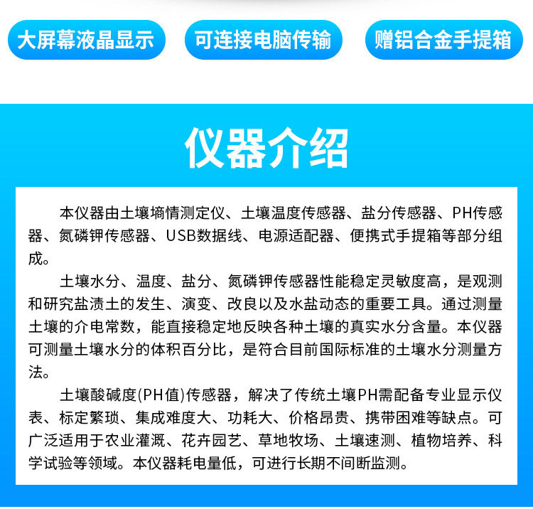 .廣泛應(yīng)用于土壤酸堿度的檢測、旱作節(jié)水灌溉、精細(xì)農(nóng)業(yè)、林業(yè)、地質(zhì)勘探、植物培育、水利、環(huán)保等領(lǐng)域。