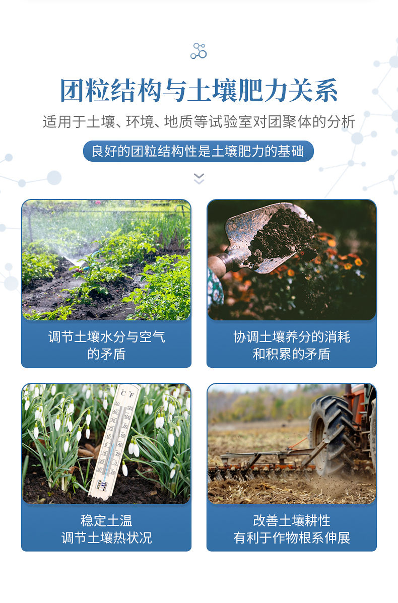 1、土壤團粒結(jié)構(gòu)對土壤肥力起著重要作用。良好的團粒結(jié)構(gòu)體一般應(yīng)具備三方面的性質(zhì):具有一定的大小,過大或過小都對形成適當(dāng)?shù)目紫侗壤焕?具有多級孔隙,大孔隙可通氣透水,小孔隙保水保肥;具有一定的穩(wěn)定性,即水穩(wěn)性、機械穩(wěn)性和生物學(xué)穩(wěn)定性。良好的團粒結(jié)構(gòu)性是土壤肥力的基礎(chǔ),團粒結(jié)構(gòu)與土壤肥力的關(guān)系主要表現(xiàn)在以下幾個方面:調(diào)節(jié)土壤水分與空氣的矛盾;協(xié)調(diào)土壤養(yǎng)分的消耗和積累的矛盾;穩(wěn)定土溫,調(diào)節(jié)土壤熱狀況;改善土壤耕性,有利于作物根系伸展。土壤團粒分析儀適用于土壤、環(huán)境、地質(zhì)等試驗室對團聚體的分析。