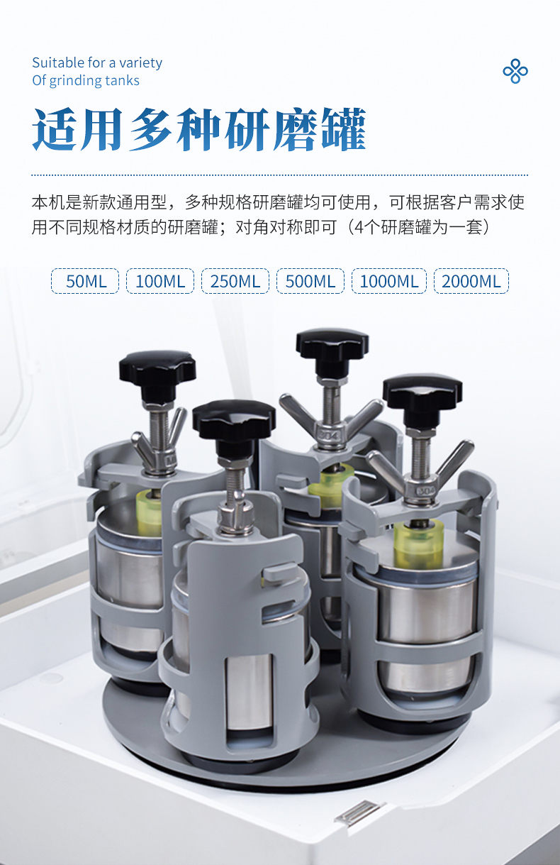 1. 適用研磨罐:本機是新款通用型,50ml規(guī)格研磨罐,可根據(jù)客戶需求使用不同材質的研磨罐;對角對稱即可(4個研磨罐為一套)。
