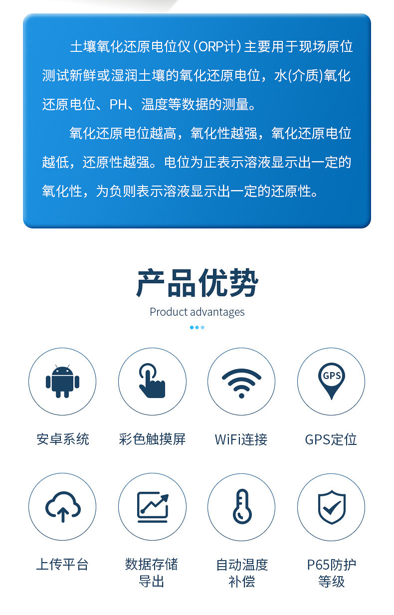 土壤氧化還原電位儀(ORP計(jì))主要用于現(xiàn)場(chǎng)原位測(cè)試新鮮或濕潤土壤的氧化還原電位,水(介質(zhì))氧化還原電位、PH、溫度等數(shù)據(jù)的測(cè)量。符合《HJ746-2015土壤氧化還原電位的測(cè)定電位法》標(biāo)準(zhǔn)。